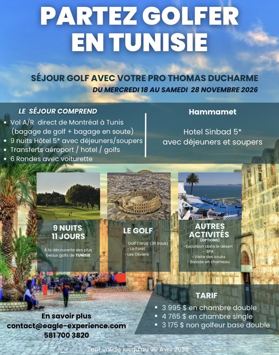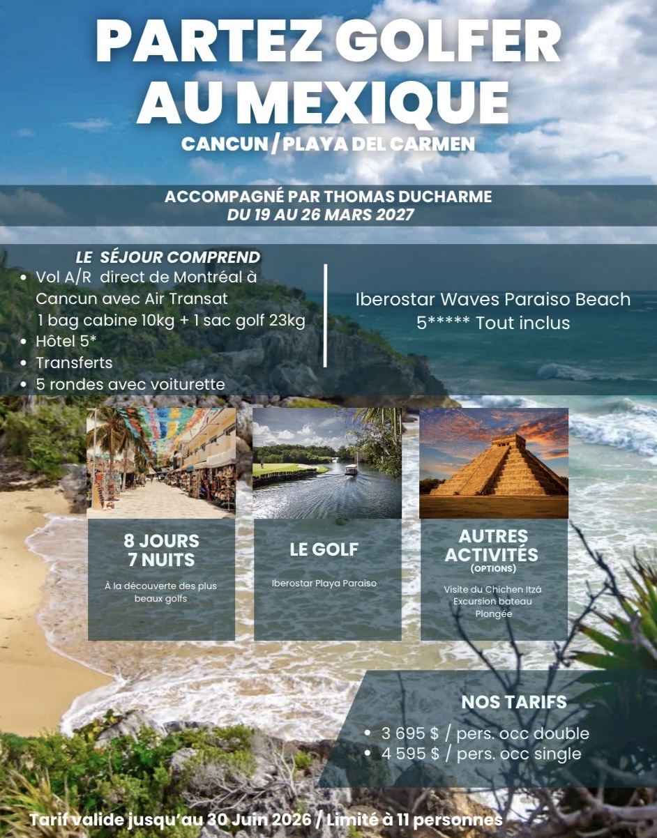 Du golf, du soleil et un Pro à vos côtés! Prolongez votre saison avec l'Académie Venise lors d'une de nos escapades de golf uniques, accompagné par notre professionnel enseignant en titre, Thomas Ducharme. Conseils sur le terrain, cliniques adaptées et plaisir garanti. Les destinations, les dates et les inscriptions suivront prochainement.