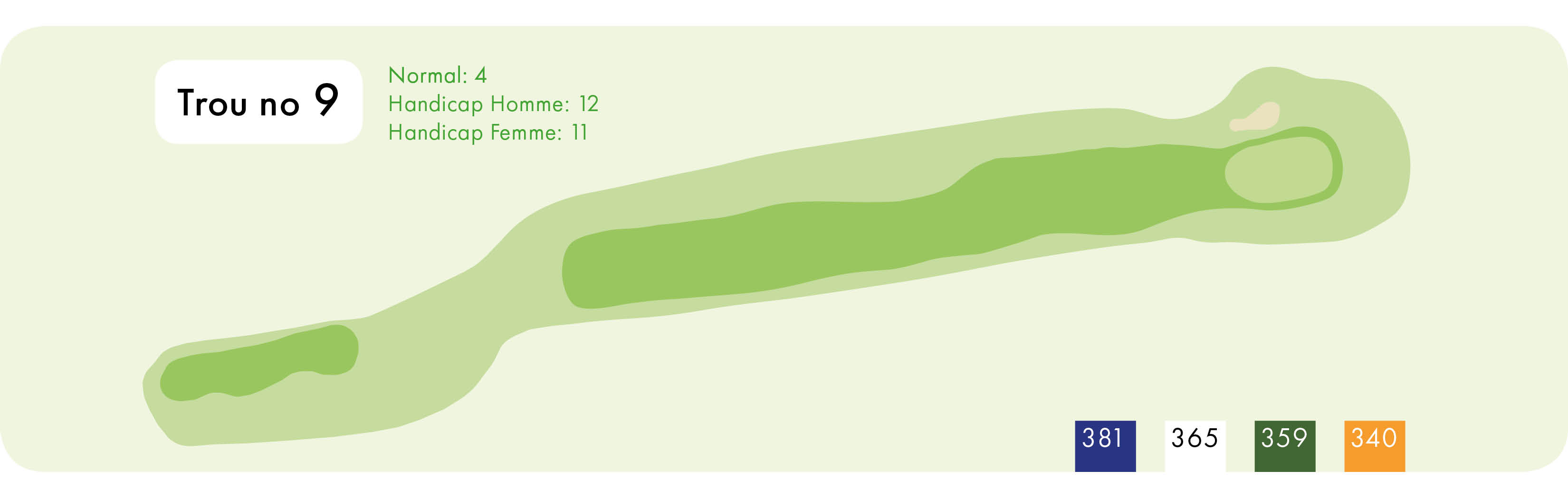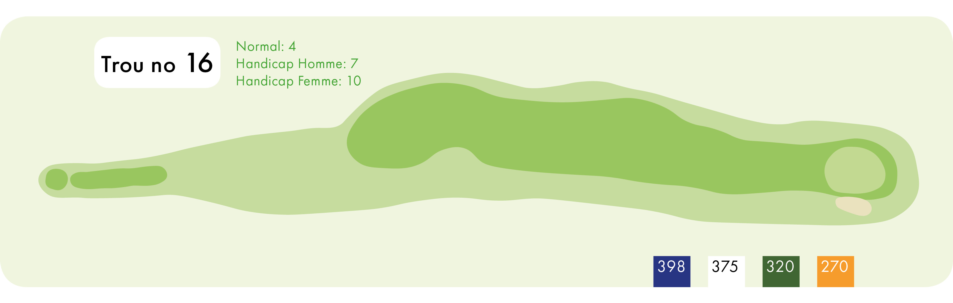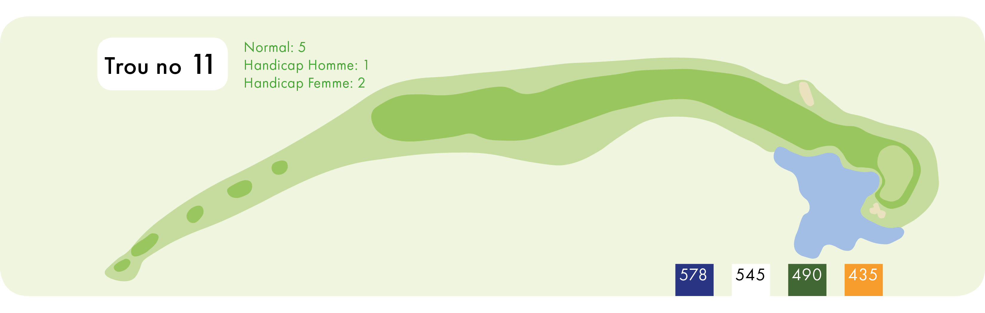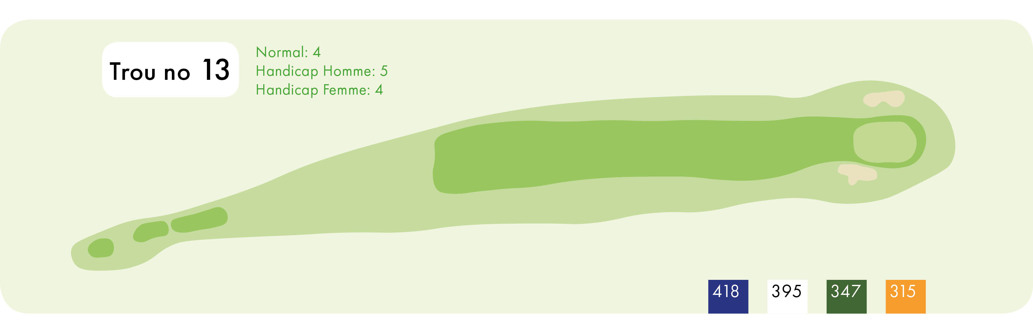D'une longueur maximale de 6791 verges à partir des départs arrières, est un excellent défi pour le golfeur. Par ailleurs, les tertres de départ sont particulièrement longs et permettent d'insérer 4 marqueurs pour différents niveaux de golfeurs et golfeuses. Les verts sont conçus pour recevoir plusieurs emplacements de drapeaux. Ils sont très grands, quelques-uns ondulés. Le panorama est majestueux et le calme qui y règne est apprécié de tous surtout quand on prend le temps de contempler le paysage: la montagne Orford d'un côté et le Lac Magog de l'autre. Les allées sont larges mais attention aux lacs sur le premier neuf. Le deuxième neuf trou est plus long et plus difficile.