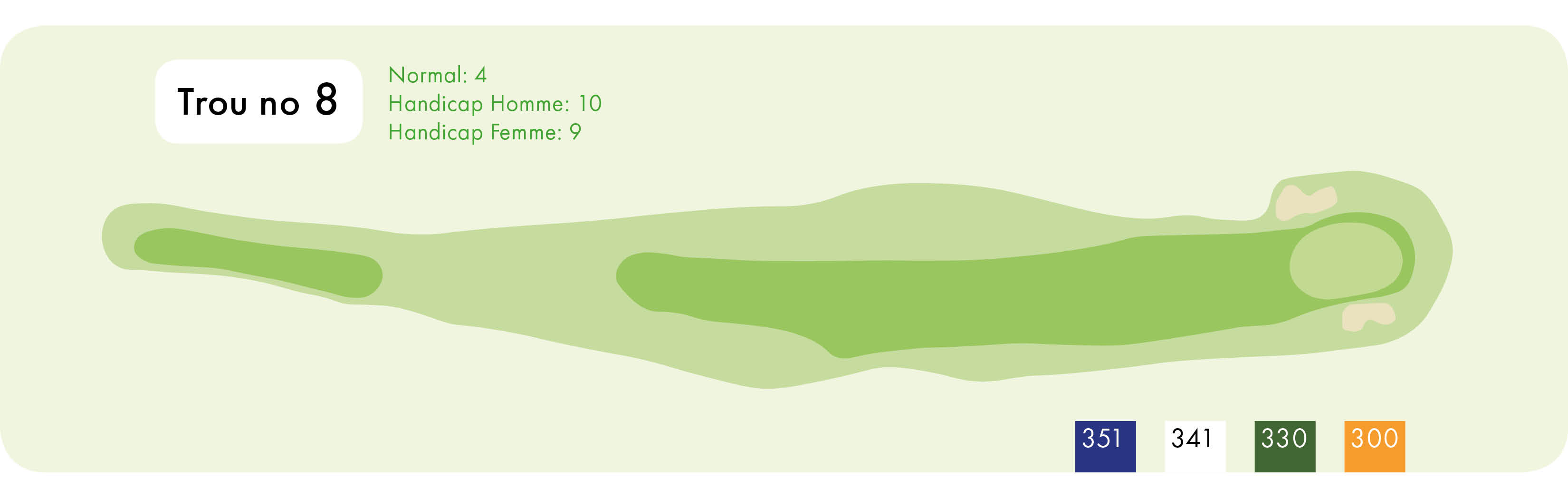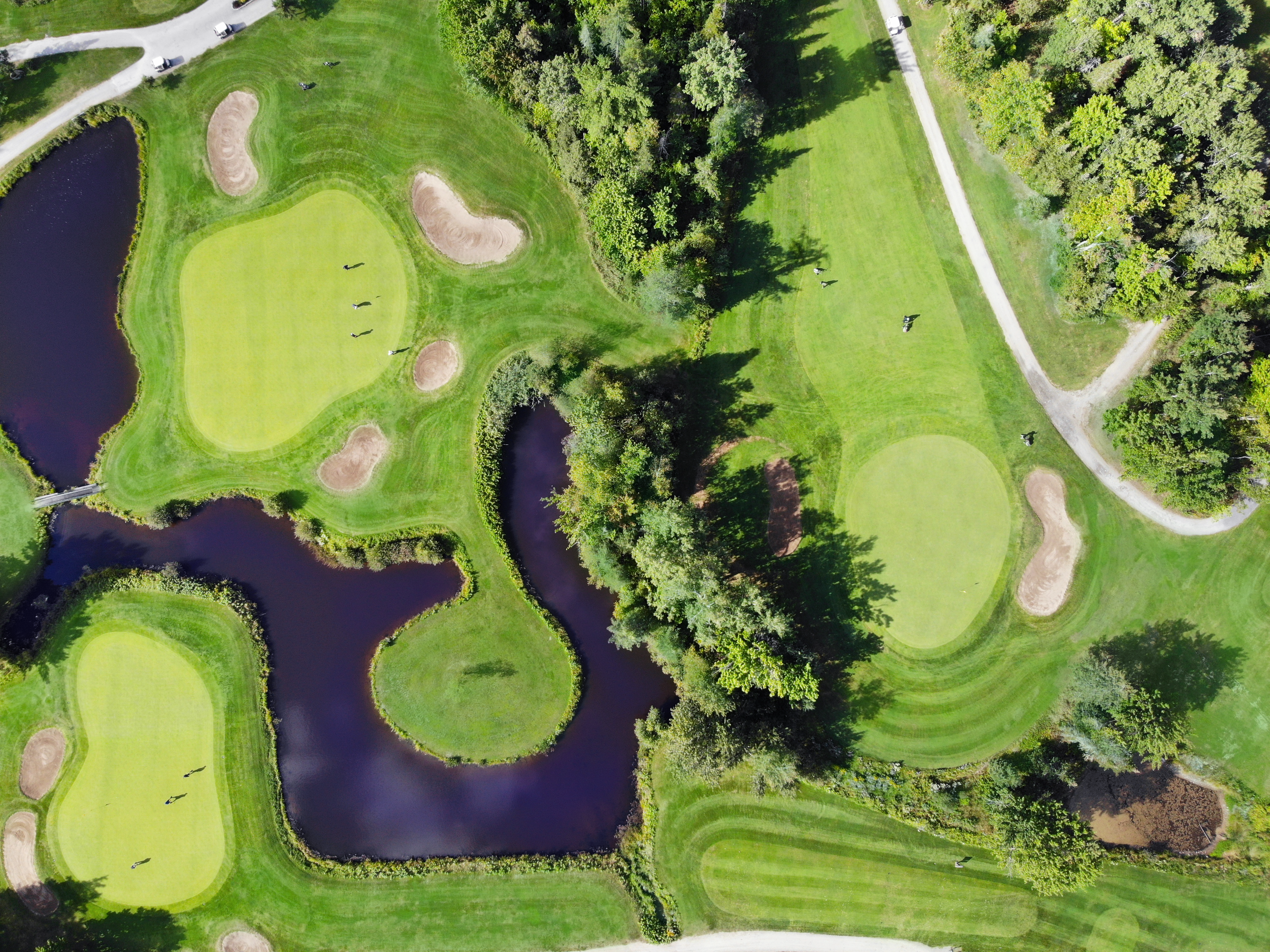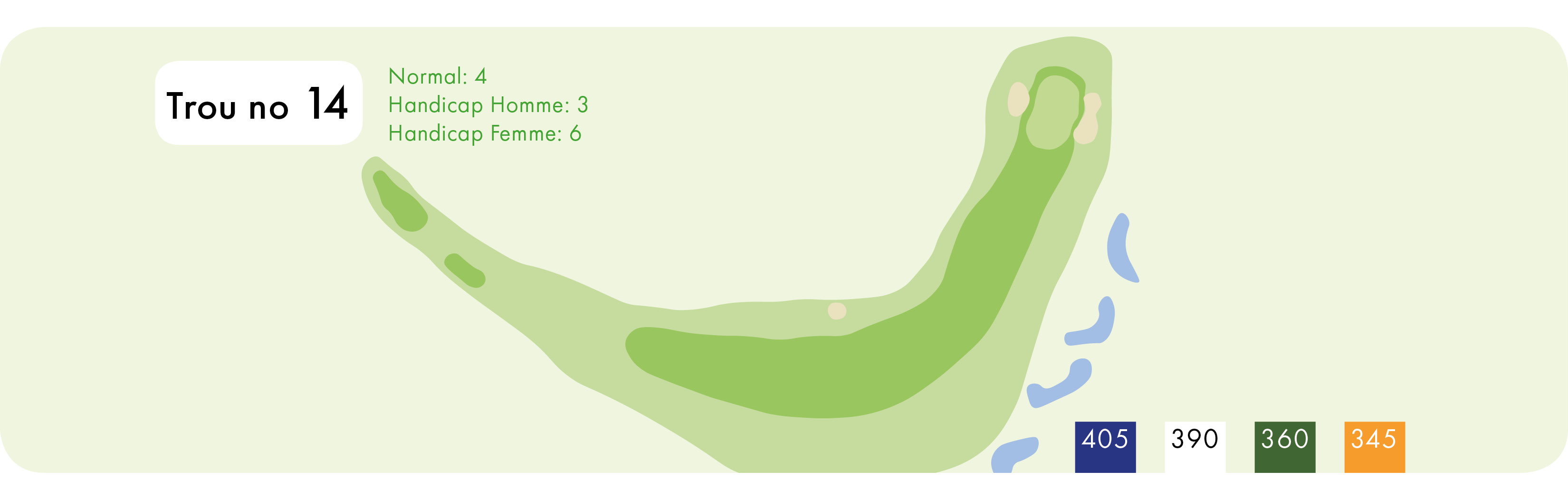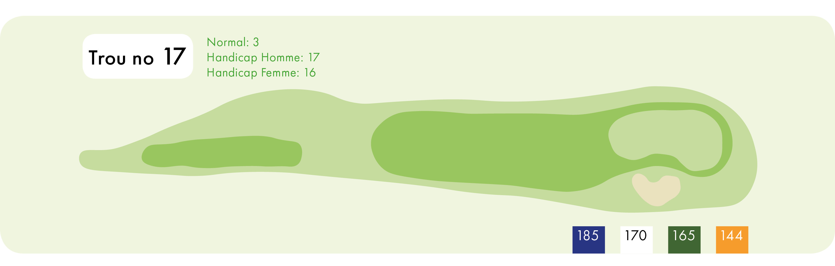 D'une longueur maximale de 6791 verges à partir des départs arrières, est un excellent défi pour le golfeur. Par ailleurs, les tertres de départ sont particulièrement longs et permettent d'insérer 4 marqueurs pour différents niveaux de golfeurs et golfeuses. Les verts sont conçus pour recevoir plusieurs emplacements de drapeaux. Ils sont très grands, quelques-uns ondulés. Le panorama est majestueux et le calme qui y règne est apprécié de tous surtout quand on prend le temps de contempler le paysage: la montagne Orford d'un côté et le Lac Magog de l'autre. Les allées sont larges mais attention aux lacs sur le premier neuf. Le deuxième neuf trou est plus long et plus difficile.