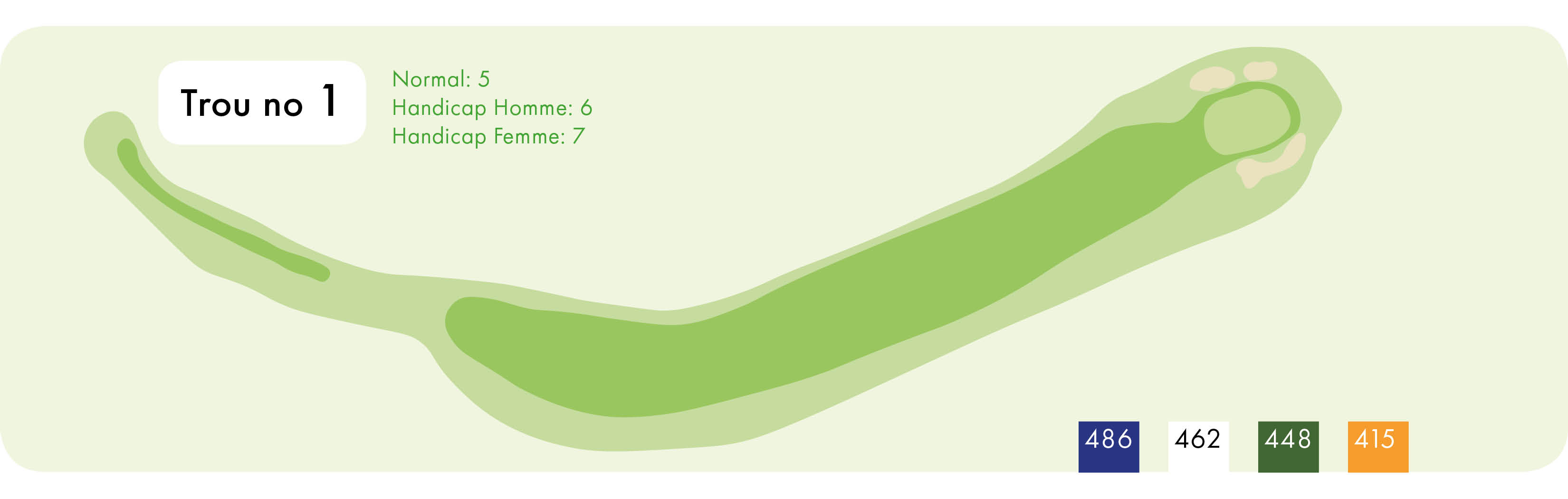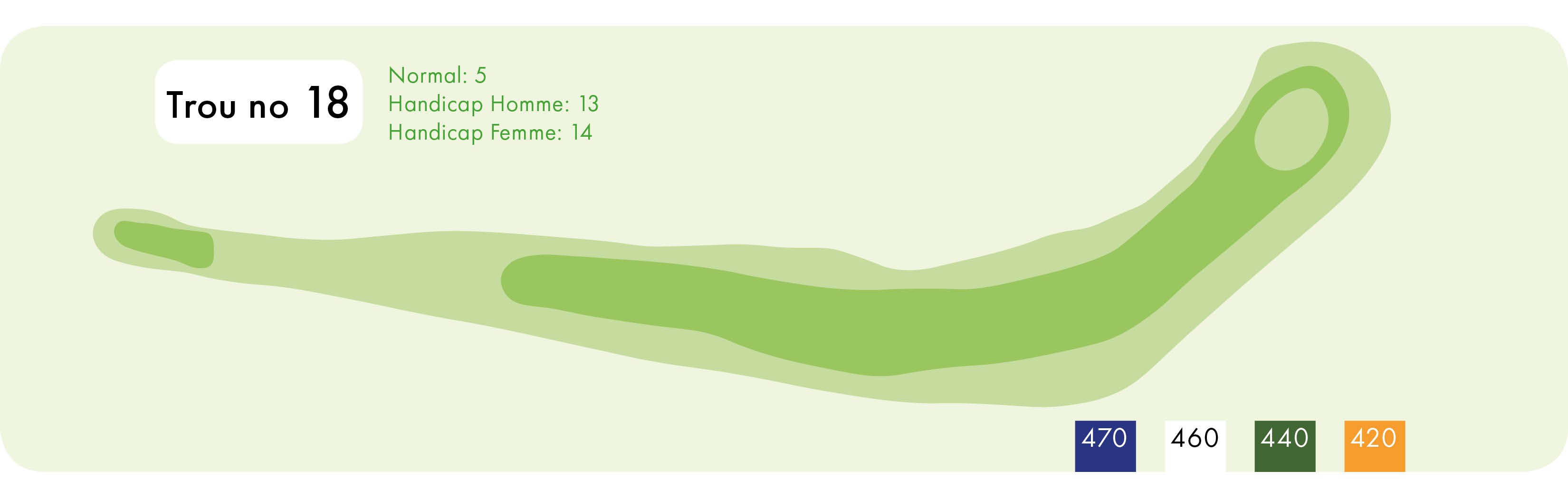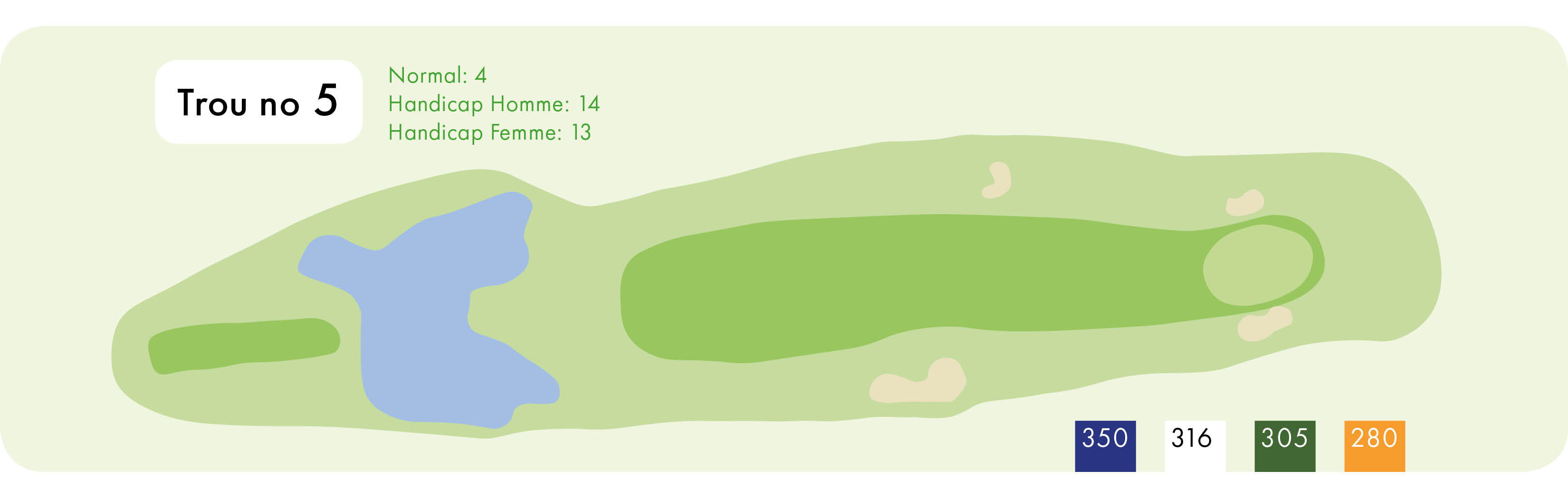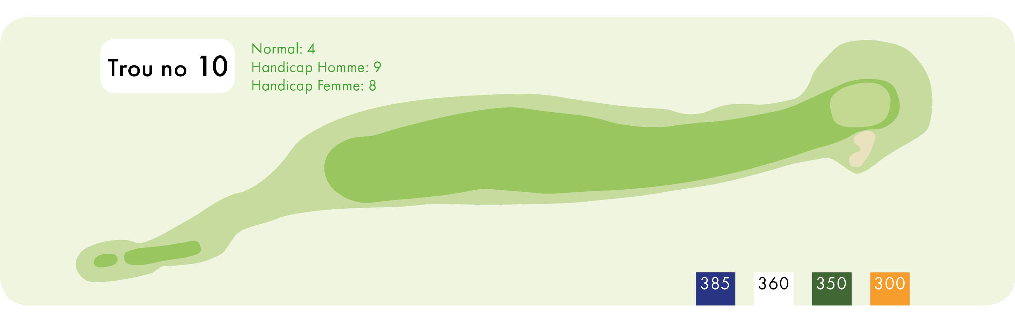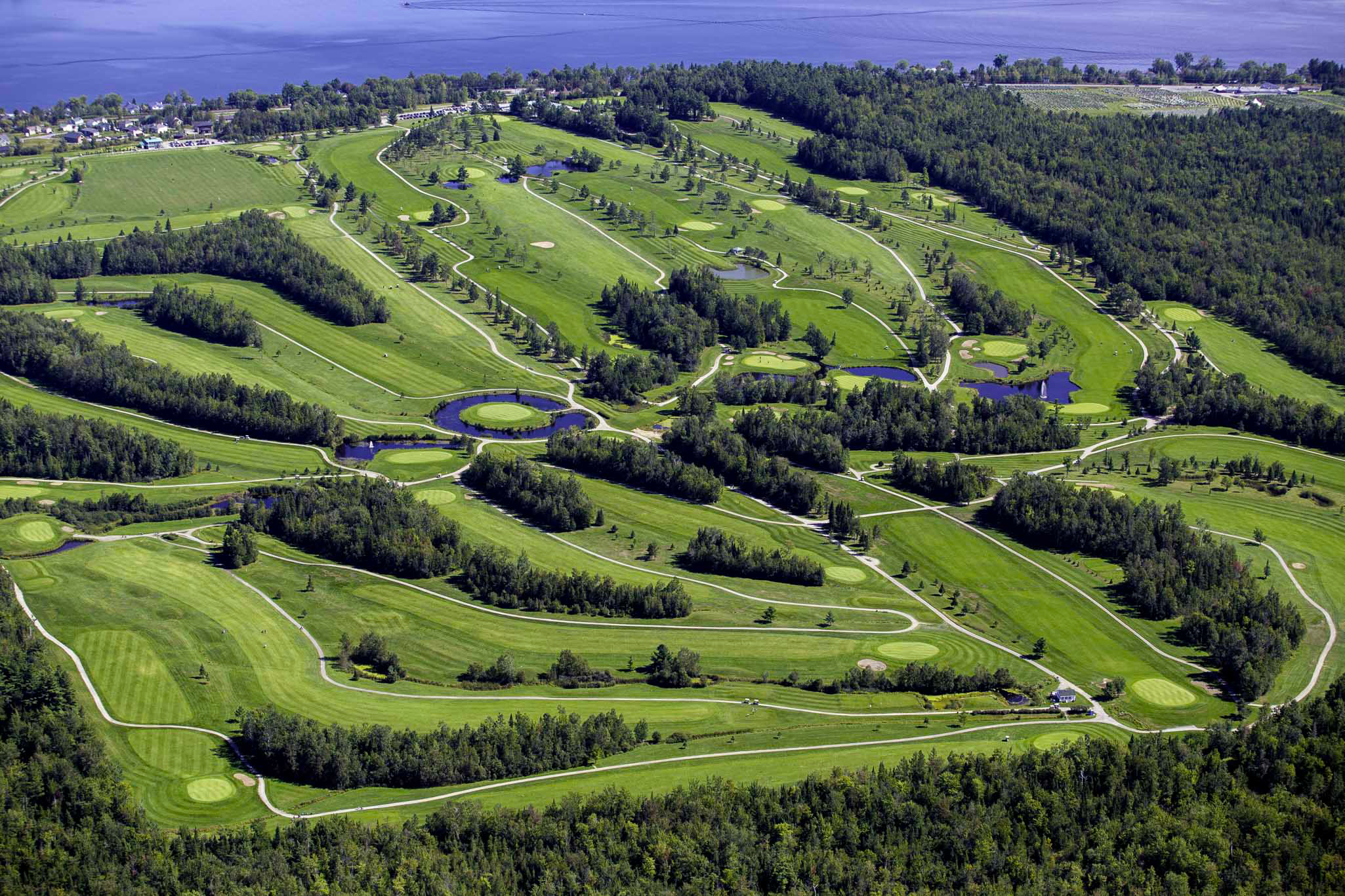 D'une longueur maximale de 6791 verges à partir des départs arrières, est un excellent défi pour le golfeur. Par ailleurs, les tertres de départ sont particulièrement longs et permettent d'insérer 4 marqueurs pour différents niveaux de golfeurs et golfeuses. Les verts sont conçus pour recevoir plusieurs emplacements de drapeaux. Ils sont très grands, quelques-uns ondulés. Le panorama est majestueux et le calme qui y règne est apprécié de tous surtout quand on prend le temps de contempler le paysage: la montagne Orford d'un côté et le Lac Magog de l'autre. Les allées sont larges mais attention aux lacs sur le premier neuf. Le deuxième neuf trou est plus long et plus difficile.