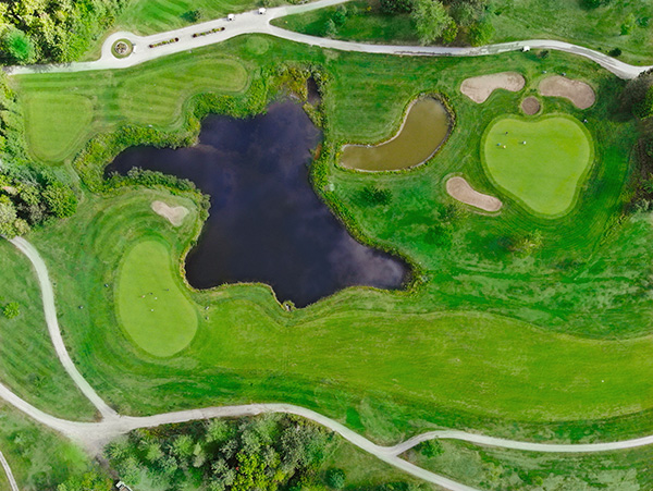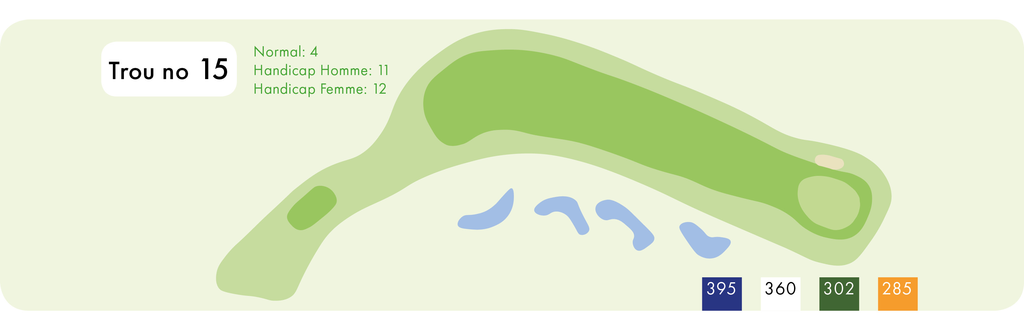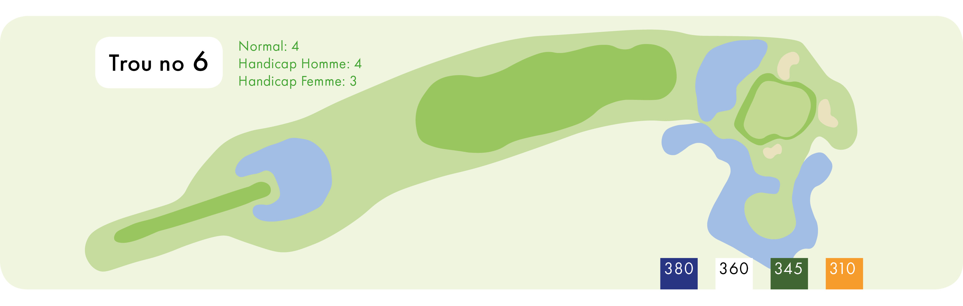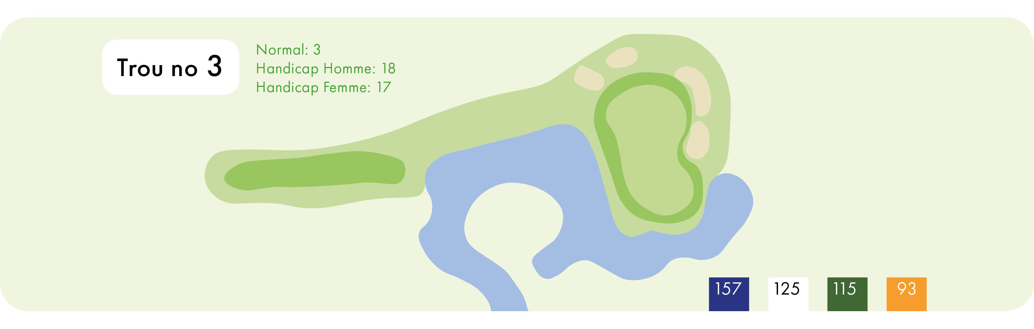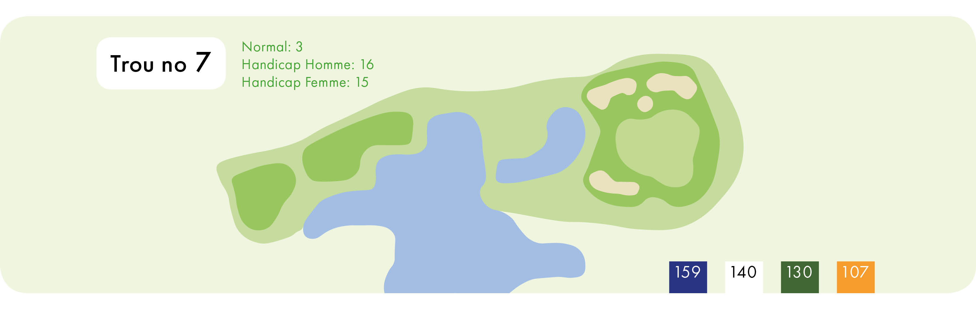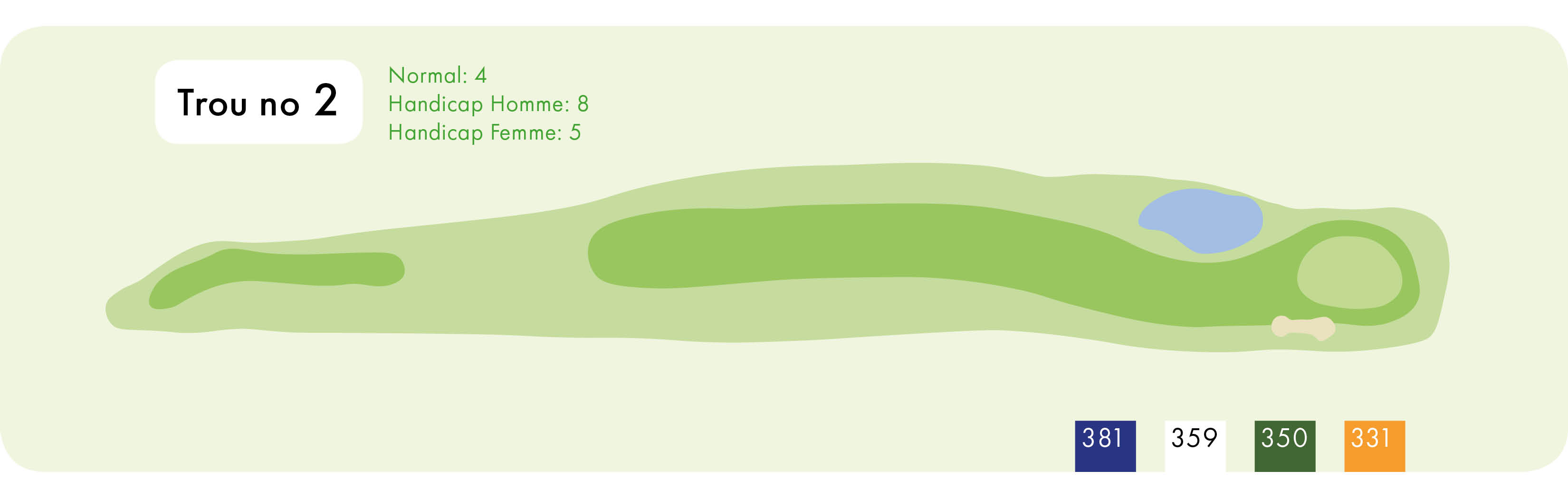D'une longueur maximale de 6791 verges à partir des départs arrières, est un excellent défi pour le golfeur. Par ailleurs, les tertres de départ sont particulièrement longs et permettent d'insérer 4 marqueurs pour différents niveaux de golfeurs et golfeuses. Les verts sont conçus pour recevoir plusieurs emplacements de drapeaux. Ils sont très grands, quelques-uns ondulés. Le panorama est majestueux et le calme qui y règne est apprécié de tous surtout quand on prend le temps de contempler le paysage: la montagne Orford d'un côté et le Lac Magog de l'autre. Les allées sont larges mais attention aux lacs sur le premier neuf. Le deuxième neuf trou est plus long et plus difficile.